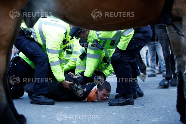 Ένας άνδρας που κρατούσε τη σημαία της Αγγλίας ακινητοποιήθηκε σήμερα στο έδαφος από την αστυνομία, έξω από την Ντάουνινγκτ Στριτ, την κατοικία του πρωθυπουργού Μπόρις Τζόνσον, μεταδίδει ένας φωτορεπόρτερ του πρακτορείου ειδήσεων Reuters.