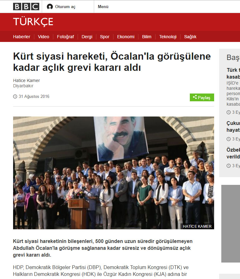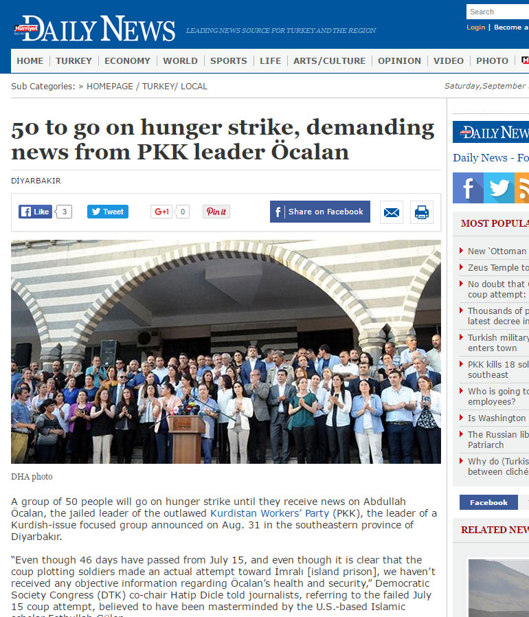 Συγκεκριμένα, σύμφωνα με δημοσιεύματα ξένων μέσων ενημέρωσης (συμπεριλαμβανομένων και τουρκικών), τουλάχιστον 50 πολίτες στο Ντιγιαρμπακίρ ανακοίνωσαν πως από τις 5 Σεπτεμβρίου ξεκινούν απεργία πείνας μέχρι να επικοινωνήσουν με τον Οτσαλάν.
