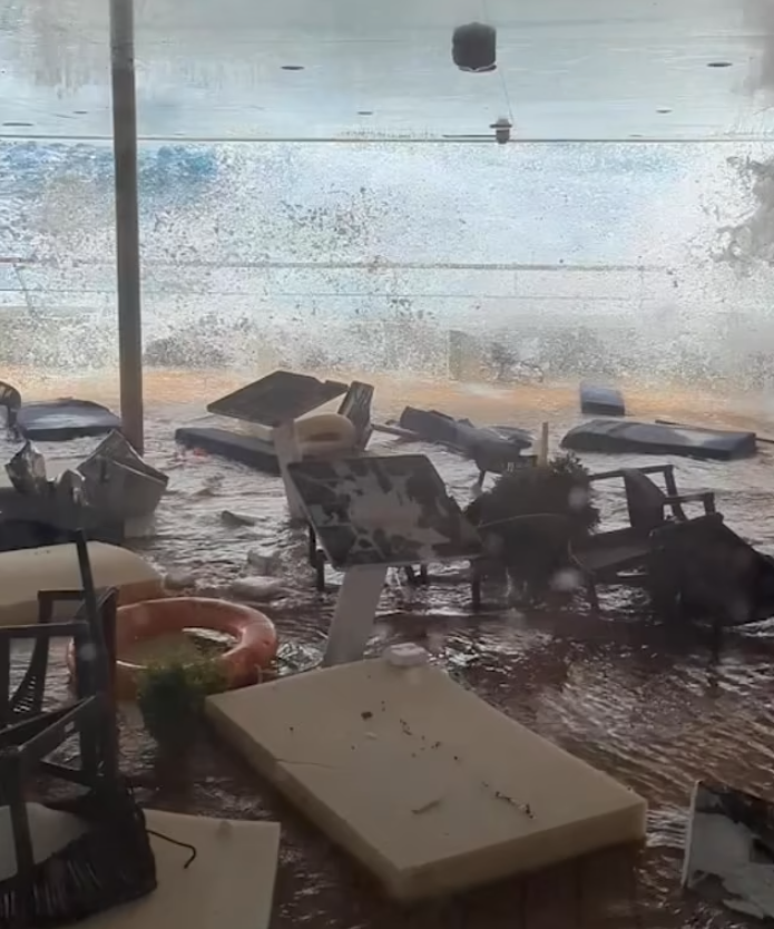 Τραπέζια, καρέκλες, ξαπλώστρες και κάθε είδους άλλα σκουπίδια επιπλέουν στη θάλασσα, αφού το κατάστρωμα κατακλύστηκε από τα άγρια νερά, μεταδίδει η Daily Mail.