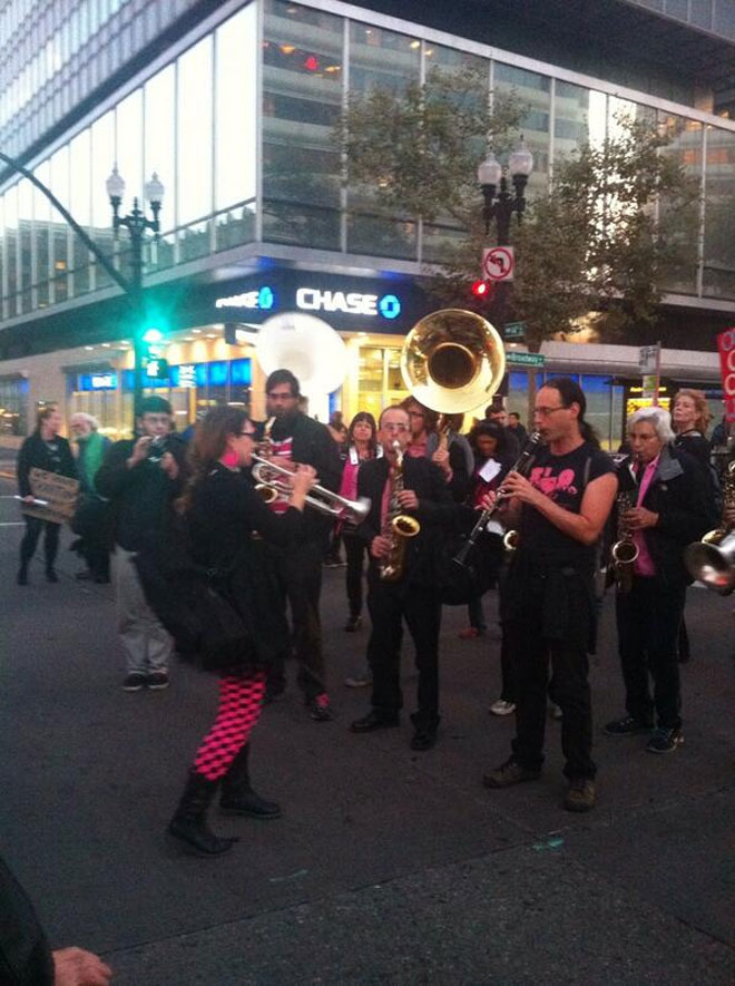 Στον αντίποδα, αυτή την ώρα, στο Όκλαντ, διεξήχθη πορεία προς το μέρος όπου λαμβάνει χώρα το “Urban Shield” και το Δημαρχείο, με ακτιβιστές να παίζουν μουσικά όργανα και να τραγουδούν ειρηνικά, απαιτώντας όπως λένε από την κυβέρνηση των ΗΠΑ να σταματήσει να χρηματοδοτεί τον πόλεμο.