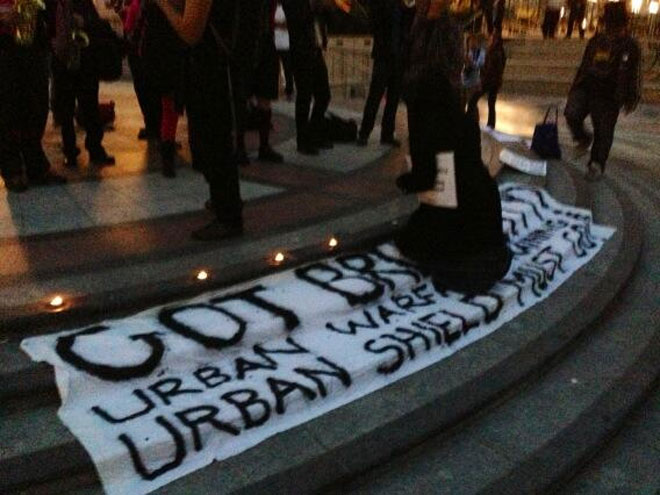 Στον αντίποδα, αυτή την ώρα, στο Όκλαντ, διεξήχθη πορεία προς το μέρος όπου λαμβάνει χώρα το “Urban Shield” και το Δημαρχείο, με ακτιβιστές να παίζουν μουσικά όργανα και να τραγουδούν ειρηνικά, απαιτώντας όπως λένε από την κυβέρνηση των ΗΠΑ να σταματήσει να χρηματοδοτεί τον πόλεμο.
