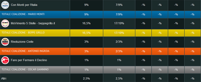 Σύμφωνα πάντα με το exit poll της RAI η Κεντροαριστερά κερδίζει 340 έδρες στη Κάτω Βουλή, ο Μπερλουσκόνι και η Λέγκα του Βορρά 140 έδρες, ο Μπέπε Γκρίλο και το Κίνημα 5 Αστέρων 91 έδρες και ο Μάριο Μόντι 46 έδρες, για το σχηματισμό κυβέρνησης χρειάζεται 50 + 1% δηλαδή πάνω από 316 έδρες.