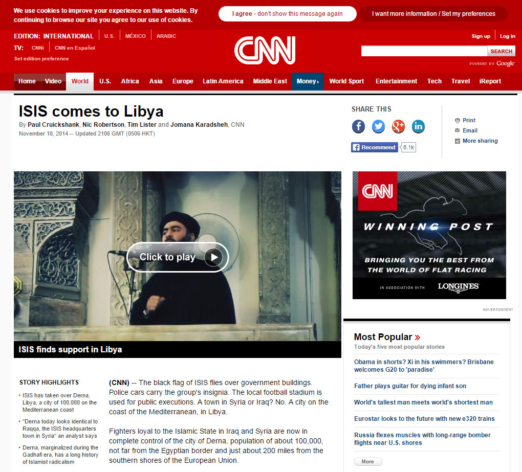 Η μαύρη σημαία του Ισλαμικού Χαλιφάτου κυματίζει σε κυβερνητικά κτήρια. Τα οχήματα της αστυνομίας φέρουν τα διακριτικά της οργάνωσης. Το τοπικό στάδιο ποδοσφαίρου χρησιμοποιείται για δημόσιες εκτελέσεις. Η εικόνα δεν προέρχεται από μία πόλη της Συρίας ή του Ιράκ αλλά από μία στις ακτές της Μεσογείου, στη Λιβύη.
