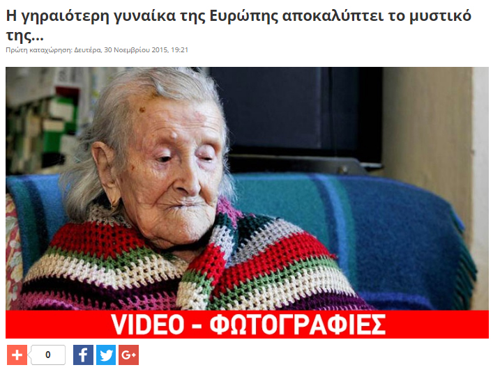 Πλέον, σύμφωνα με την ομάδα Αμερικανών ερευνητών Gerontology Research Group (GRG), η γηραιότερη γυναίκα στον πλανήτη αυτήν τη στιγμή είναι η Violet Brown από την Τζαμάικα, η οποία γεννήθηκε στις 10 Μαρτίου 1900.