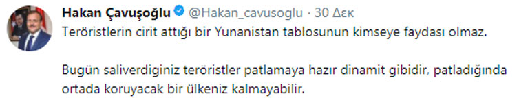 Ο συνεργάτης του Ρετζέπ Ταγίπ Ερντογάν αναφέρεται στο θέμα των Τούρκων στρατιωτικών τονίζοντας πως «δεν έχουν αντιληφθεί πόσο μεγάλος κίνδυνος είναι για την Ελλάδα και τον ελληνικό λαό κάθε μέλος της FETÖ που αφήνεται ελεύθερο». Μεταξύ άλλων εκτιμά πως «δεν ωφελεί κανέναν μια εικόνα της Ελλάδας στην οποία συνωστίζονται οι τρομοκράτες».