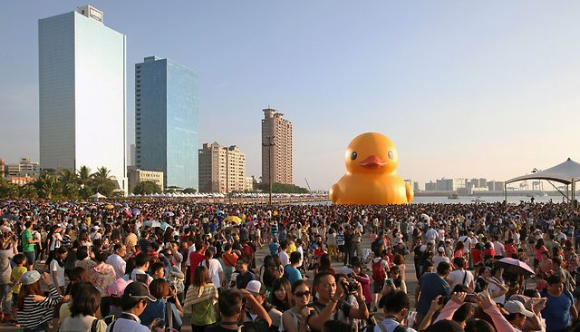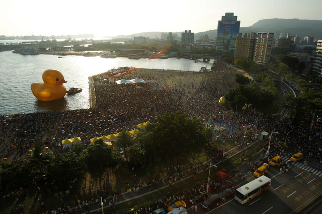 Χιλιάδες άνθρωποι συγκεντρώθηκαν την Πέμπτη στην κεντρική προβλήτα παραθαλάσσιας πόλης της Ταϊβάν, για να υποδεχτούν το περίφημο φουσκωτό παπί, το οποίο συνεχίζει το ταξίδι του σε διάφορα σημεία του κόσμου.