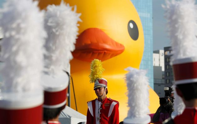 Όπως μετέδωσε το Associated Press, το τεράστιο πλαστικό παπί, ύψους 18 μ., έχει δημιουργηθεί από τον Ολλανδό καλλιτέχνη, Florentijn Hofman, ο οποίος επιδιώκει να στείλει με αυτό τον τρόπο ένα παγκόσμιο μήνυμα ειρήνης και χαράς.