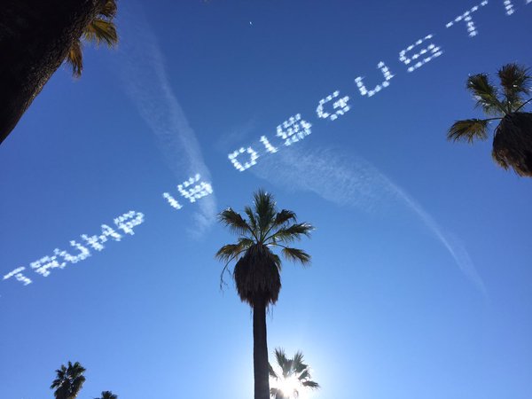 «Η Αμερική είναι υπέροχη. Ο Τραμπ είναι αηδιαστικός. Όποιος να’ ναι εκτός από τον Τραμπ» ανέφεραν τα μηνύματα, κάνοντας χιλιάδες θεατές να σηκώνουν ψηλά το βλέμμα τους για να αντικρίσουν το θέαμα.