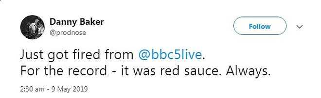 «Μόλις απολύθηκα» δήλωσε στο Twitter ο Ντάνι Μπέικερ, παρουσιαστής του BBC Radio 5 Live. Την είδηση μετέδωσε επίσης το BBC, εκπρόσωπος του οποίου δεν ανταποκρίθηκε αμέσως σε αίτημα για σχόλια.
