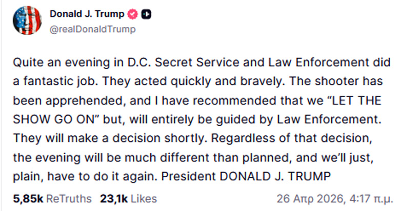 «Περάσαμε ένα αρκετά καλό βράδυ στην Ουάσινγκτον, η Μυστική Υπηρεσία και οι Αρχές Επιβολής του Νόμου έκαναν φανταστική δουλειά. Ενήργησαν γρήγορα και γενναία. Ο δράστης συνελήφθη και έχω συστήσει να «να αφήσουμε την παράσταση (εκδήλωση) να συνεχιστεί υπό την καθοδήγηση των Αρχών. Ανεξάρτητα από αυτήν την απόφαση, η βραδιά θα είναι πολύ διαφορετική από ό,τι είχε προγραμματιστεί και, απλά, θα πρέπει να το ξανακάνουμε», δήλωσε ο Τραμπ στην ανάρτησή του στο Truth Social.