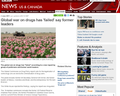 Ο παγκόσμιος πόλεμος κατά των ναρκωτικών έχει αποτύχει, σύμφωνα με κείμενο που είδε χθες το φως της δημοσιότητας και το οποίο υπογράφει επιτροπή αποτελούμενη από 19 μέλη, συμπεριλαμβανομένων αρκετών πρώην ηγετών της Λατινικής Αμερικής. Μεταξύ αυτών που αναφέρονται είναι και ο πρώην γενικός γραμματέας του Ο.Η.Ε., Kofi Annan καθώς και ο νυν πρωθυπουργός της Ελλάδας, Γιώργος Παπανδρέου.