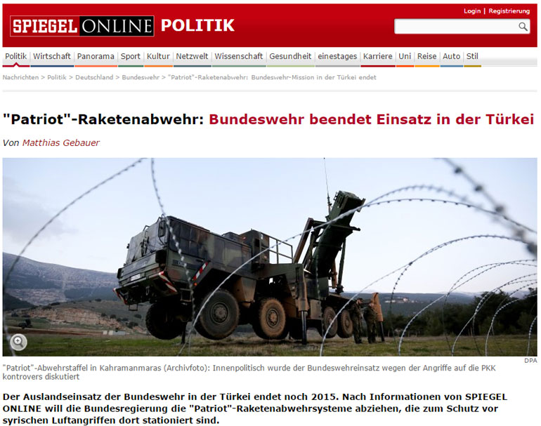 Αυτά αναφέρει σε δημοσίευμα του το «Spiegel online», κάτι που επιβεβαίωσε εκπρόσωπος του Υπουργείου Άμυνας της Γερμανίας. «Η στρατιωτική αποστολή των πυραύλων Patriot στην Τουρκία ήταν ένα σημαντικό «φύλλο πορείας» για το γερμανικό Ομοσπονδιακό Στρατό. Τώρα θα φέρουμε πίσω τους στρατιώτες μας», επιβεβαιώνει το γερμανικό Υπουργείο Άμυνας.