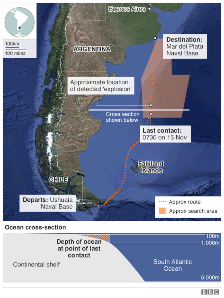 Το υποβρύχιο, με 44 μέλη πληρώματος, εξαφανίστηκε αφού ανέφερε ότι είχε ένα ηλεκτρολογικό πρόβλημα. Η τελευταία θέση στην οποία είχε επισημανθεί το υποβρύχιο ήταν περί τα 300 μίλια από τις νότιες ακτές της Αργεντινής.