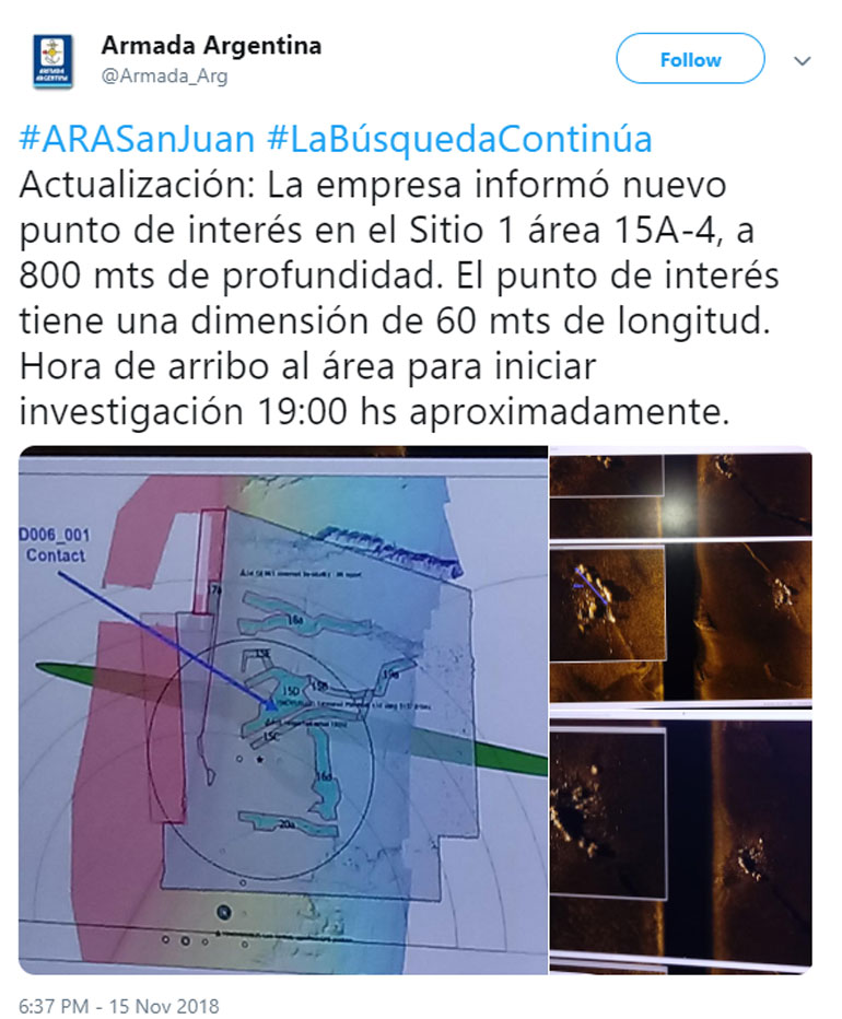 «Το Yπουργείο Άμυνας και το Πολεμικό Ναυτικό της Αργεντινής ενημερώνουν ότι η εξέταση του αντικειμένου 24 το οποίο εντοπίστηκε από την εταιρεία Ocean Infinity με τη βοήθεια μιας τηλεχειριζόμενης συσκευής σε βάθος 800 μέτρων επέτρεψε τον εντοπισμό του ARA San Juan» ανέφερε σε ανάρτησή του το επιτελείο του Πολεμικού Ναυτικού της λατινοαμερικανικής χώρας.