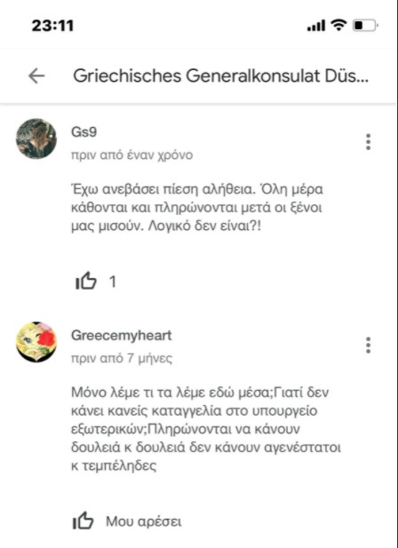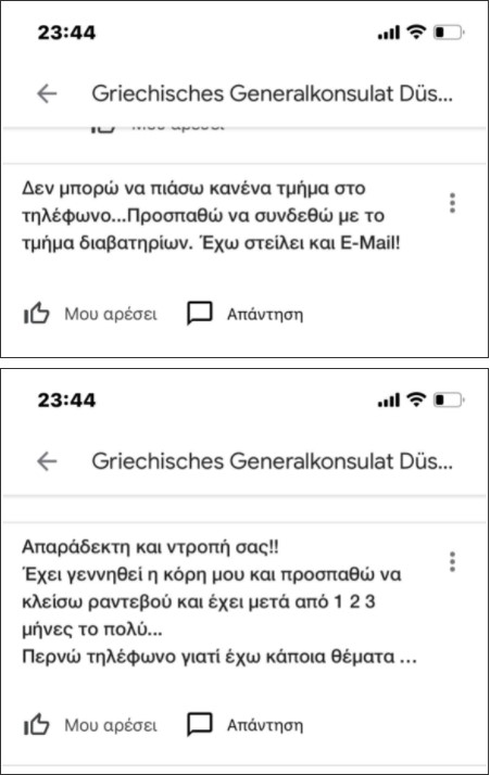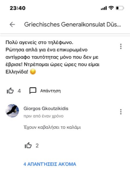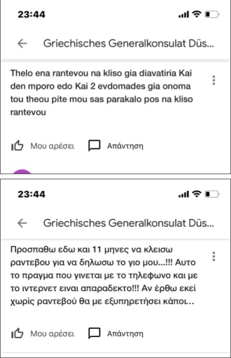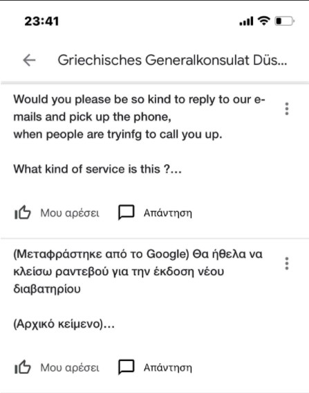 Πολλά παράπονα υπάρχουν από τους Έλληνες του εξωτερικού καθώς δεν μπορούν να δηλώσουν τα παιδιά τους στο ληξιαρχείο ή να βγάλουν διαβατήριο στα παιδιά τους ώστε να ταξιδέψουν στη χώρα μας. Αδύνατη είναι όμως και η επικοινωνία των γερμανικών αρχών με τα ελληνικά προξενεία. Τρανταχτό παράδειγμα η υπόθεση του Διονύση Αγγελάκου το 2019, ο οποίος βρέθηκε νεκρός σε πόλη της Γερμανίας και ενώ στη χώρα μας είχε δηλωθεί ως αγνοούμενος οι γερμανικές αρχές τον είχαν αποτεφρώσει, χωρίς να ενημερωθούν οι συγγενείς του. Ο λόγος ήταν η αδυναμία επικοινωνίας των γερμανικών αρχών με το ελληνικό προξενείο της Φρανκφούρτης διότι κανείς δε σήκωνε τα τηλέφωνα αλλά ούτε απάντησαν στο e-Mail που έστειλαν και τους ανέφεραν την άμεση ανάγκη για επικοινωνία μαζί τους, αναφέροντάς τους το θάνατο του Έλληνα υπηκόου.