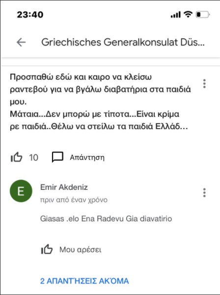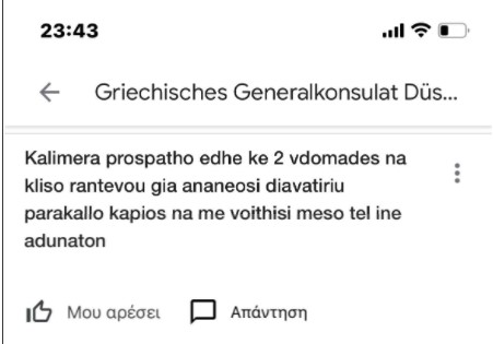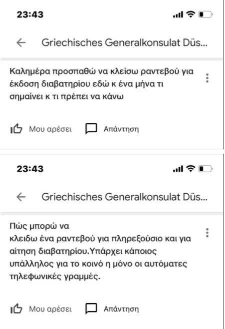 Αυτό όμως δεν είναι το μοναδικό πρόβλημα που έχουν να αντιμετωπίσουν. Το σημαντικότερο πρόβλημα είναι ότι για να πάει κάποιος στο προξενείο χρειάζεται ραντεβού πράγμα αδύνατο όμως καθώς στα τηλέφωνα δεν απαντάει κανείς και καταλήγουν να ακούνε ηχογραφημένα μηνύματα με οδηγίες για να κλείσουν ηλεκτρονικά ένα ραντεβού. Μπαίνοντας στην ηλεκτρονική διεύθυνση του προξενείου έχουμε τη δυνατότητα να βάλουμε τα στοιχεία μας και να κλείσουμε ραντεβού ή μάλλον έτσι πιστεύουμε γιατί ενώ πατάμε κανονικά τα στοιχεία μας στη συνέχεια δεν δέχεται το e-Mail, και κάπως έτσι οι ομογενείς συναντούν πολλά προβλήματα εξαιτίας της ανικανότητας των προξενικών αρχών.