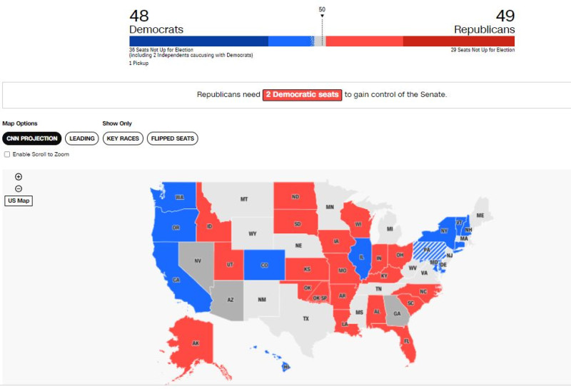 Προς το παρόν, οι Ρεπουμπλικανοί έχουν εκλέξει 49 γερουσιαστές, έναντι 48 των Δημοκρατικών. Εκκρεμούν τρεις Πολιτείες, εκ των οποίων η μία, η Τζόρτζια, έχει πάει σε 2ο γύρο, ενώ στις άλλες δύο – Αριζόνα και Νεβάδα- συνεχίζεται η καταμέτρηση.