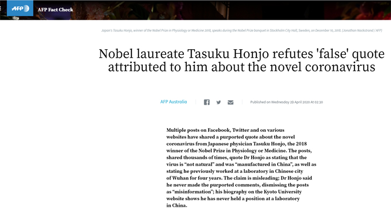 Διεθνείς διαστάσεις πήρε το δημοσίευμα με θέμα την υποτιθέμενη, τελικά, δήλωση του Ιάπωνα καθηγητή Φυσιολογίας και Ιατρικής και Νομπελίστα Tasuku Honjo , σύμφωνα με την οποία ο Covid-19 είναι προϊόν εργαστηρίου.