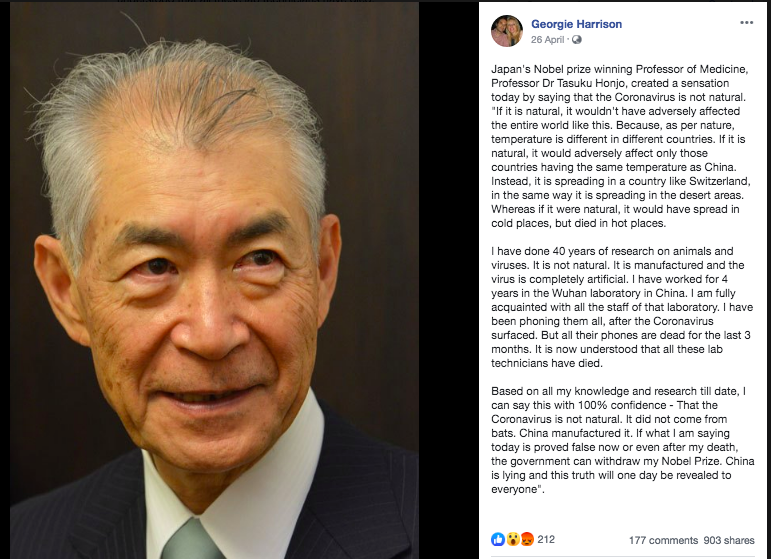 «Ο Ιάπωνας καθηγητής Φυσιολογίας και Ιατρικής Tasuku Honjo προκάλεσε αίσθηση στα media σήμερα λέγοντας πως ο κορωνοϊός δεν είναι φυσικός. Αν ήταν φυσικός, δεν θα επηρέαζε όλον τον κόσμο κατά αυτόν τον τρόπο. Γιατί, ανάλογα με τη φύση, το κλίμα διαφέρει ανάμεσα στις χώρες. Αν ήταν φυσικός, τότε θα επηρέαζε μόνο τις χώρες που έχουν παρόμοιο κλίμα με την Κίνα. Αντ’ αυτού, εξαπλώνεται σε χώρες όπως η Ελβετία με τον ίδιο τρόπο που εξαπλώνεται σε περιοχές με έρημο. Αν ήταν φυσικός, τότε θα είχε εξαπλωθεί σε παγωμένες περιοχές, αλλά θα είχε εξαφανιστεί στις πιο θερμές περιοχές.