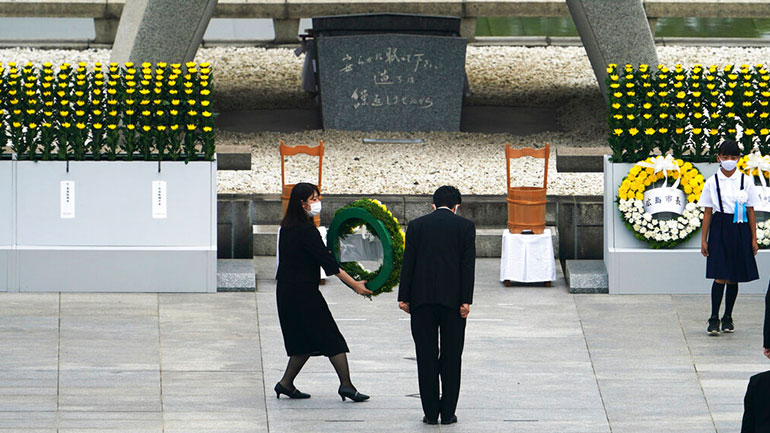 Επιζώντες της ατομικής βόμβας (οι χιμπακούσα, όπως αποκαλούνται), απόγονοι των θυμάτων, ο Ιάπωνας πρωθυπουργός Σίνζο Άμπε και μερικοί αντιπρόσωποι ξένων κυβερνήσεων, φορώντας τις μάσκες τους, συμμετείχαν στην εκδήλωση στη Χιροσίμα (δυτική Ιαπωνία).