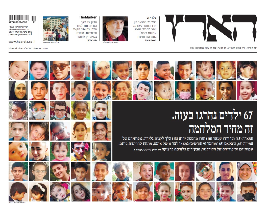 Σε μία σπάνια εκδήλωση διεθνιστικής αλληλεγγύης και συνάμα δημοκρατικής συνείδησης προχώρησε η ισραηλινή εφημερίδα Haaretz, η οποία στη σημερινή της έντυπη έκδοση στα εβραϊκά δημοσιεύει στην πρώτη της σελίδα τις φωτογραφίες των παιδιών των Παλαιστινίων που σκοτώθηκαν από ισραηλινούς βομβαρδισμούς κατά την πρόσφατη πολεμική σύγκρουση στη Γάζα.