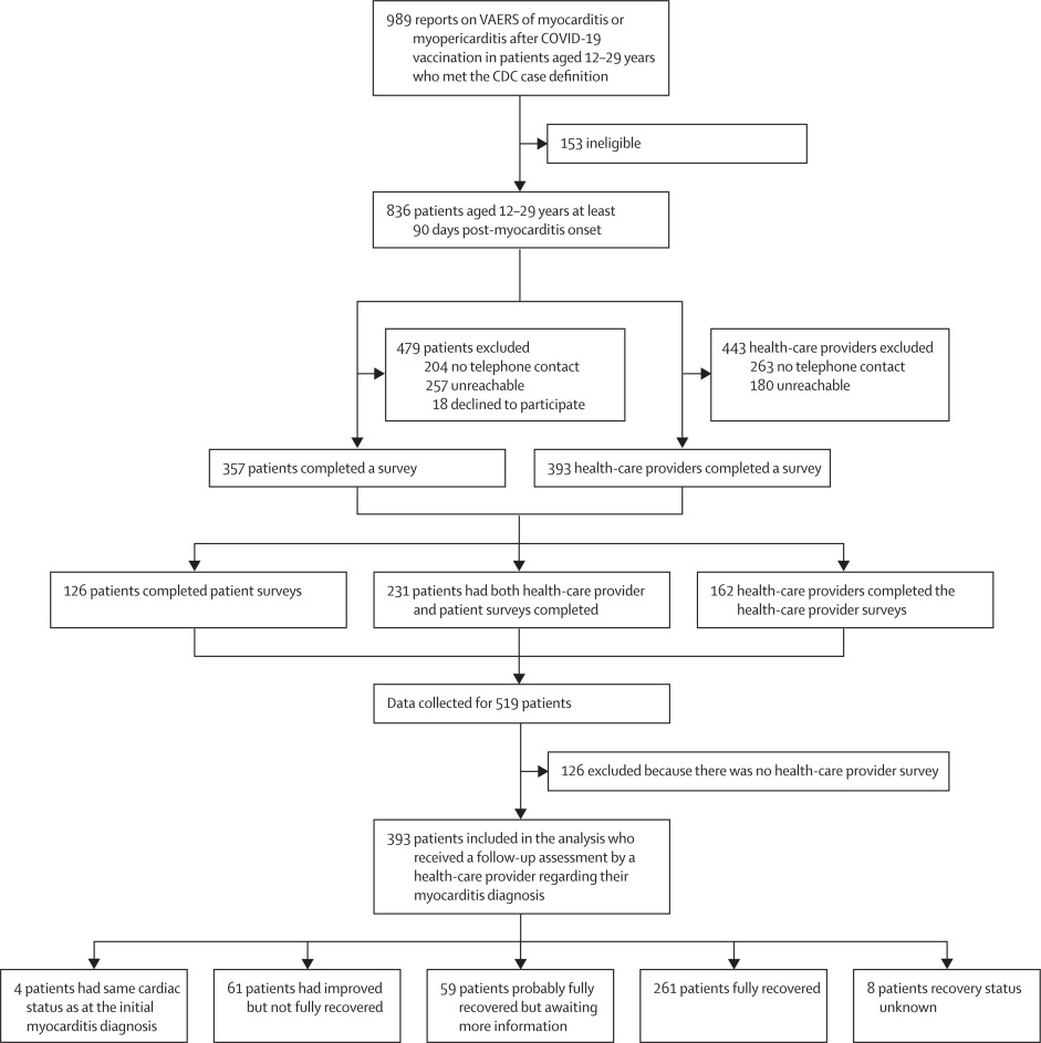 Ερευνητές του CDC (παρακολούθησαν νέους που παρουσίασαν μυοκαρδίτιδα μετά τη λήψη των εμβολίων COVID-19 της Pfizer ή της Moderna και τα αποτελέσματα αναφέρθηκαν στο The Lancet *. Το 47% των 836 ασθενών ηλικίας 12 έως 29 ετών εμφάνισαν μυοκαρδίτιδα μετά τον εμβολιασμό τουλάχιστον 90 ημέρες πριν από τη συμπλήρωση της έρευνας. Η μυοκαρδίτιδα για κάθε ασθενή αναφέρθηκε στο σύστημα αναφοράς ανεπιθύμητων συμβάντων εμβολίων. Οι ασθενείς που συμπλήρωσαν οι ίδιοι την έρευνα αποκλείστηκαν.