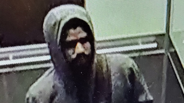Τα στιγμιότυπα από τις κάμερες παρακολούθησης δείχνουν έναν άνδρα που φοράει μάσκα προσώπου και μια τσάντα στο μπροστινό μέρος του σώματός του να σημαδεύει με όπλο σε χώρο που φαίνεται να είναι χώρος υποδοχής.