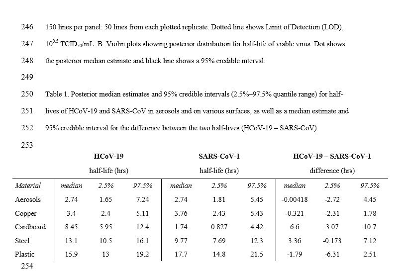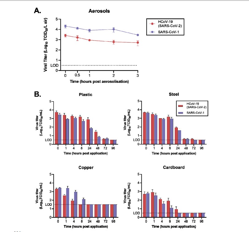 Ο Covid-19 βρέθηκε να είναι ανιχνεύσιμος έως και τρεις ώρες αργότερα στον αέρα, έως και τέσσερις ώρες στον χαλκό, έως και 24 ώρες σε χαρτόνι και μέχρι δύο ή τρεις ημέρες σε πλαστικό και ανοξείδωτο χάλυβα.
