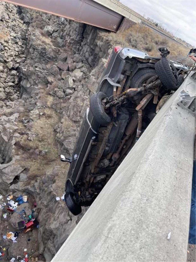 Το όχημα σώθηκε με τη βοήθεια αλυσίδων, που το συνέδεαν με το ρυμουλκούμενο τροχόσπιτο του ζευγαριού (μήκους περίπου 9 μέτρων), το οποίο παρά τη σύγκρουση, παρέμεινε πάνω στην αερογέφυρα. Αυτό είχε ως αποτέλεσμα το ζευγάρι να βρίσκεται εγκλωβισμένο μέσα στο αυτοκίνητό του, που κρεμόταν σε υψόμετρο περίπου 30μ. Η τοπική αστυνομία κλήθηκε στο σημείο του ατυχήματος περίπου στις 14:45 τη Δευτέρα, βρίσκοντας τους δύο ηλικιωμένους (67 και 64 χρονών) από το Garden City να κρέμονται, ουσιαστικά, ανάποδα πάνω από το φαράγγι του Malad Gorge. Οι δύο επιβάτες μεταφέρθηκαν στο νοσοκομείο Magic Valley. Σύμφωνα με την εκπρόσωπο του ISP Lynn Hightower, οι τραυματισμοί που φέρουν σε καμία περίπτωση δεν απειλούν τη ζωή τους.