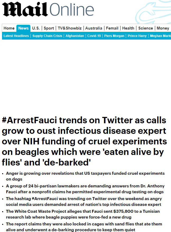 Όπως αναφέρει χαρακτηριστικά η εφημερίδα «Daily Mail», o δρ Άντονι Φάουτσι δέχεται πυρά και από τα δύο κόμματα, εφόσον, όπως υπογραμμίζουν στην επιστολή τους, χρησιμοποίησε τα χρήματα των φορολογουμένων για τα σκληρά πειράματα.