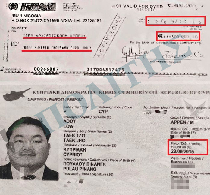 Σύμφωνα με διασταυρωμένες και αξιόπιστες πληροφορίες της κυπριακής εφημερίδας, η μεσολάβηση του Αρχιεπισκόπου προς τον τότε υπουργό Εσωτερικών Σωκράτη Χάσικο για πολιτογράφηση του Jho Low δεν έγινε… άνευ αντικρίσματος. Είναι ιδιαίτερα περίεργη η σύμπτωση, την ημέρα της εκδόσεως του διαβατηρίου, να εκδίδεται τραπεζική επιταγή σε πίστη της Ιεράς Αρχιεπισκοπής Κύπρου, ύψους 300.000 ευρώ.