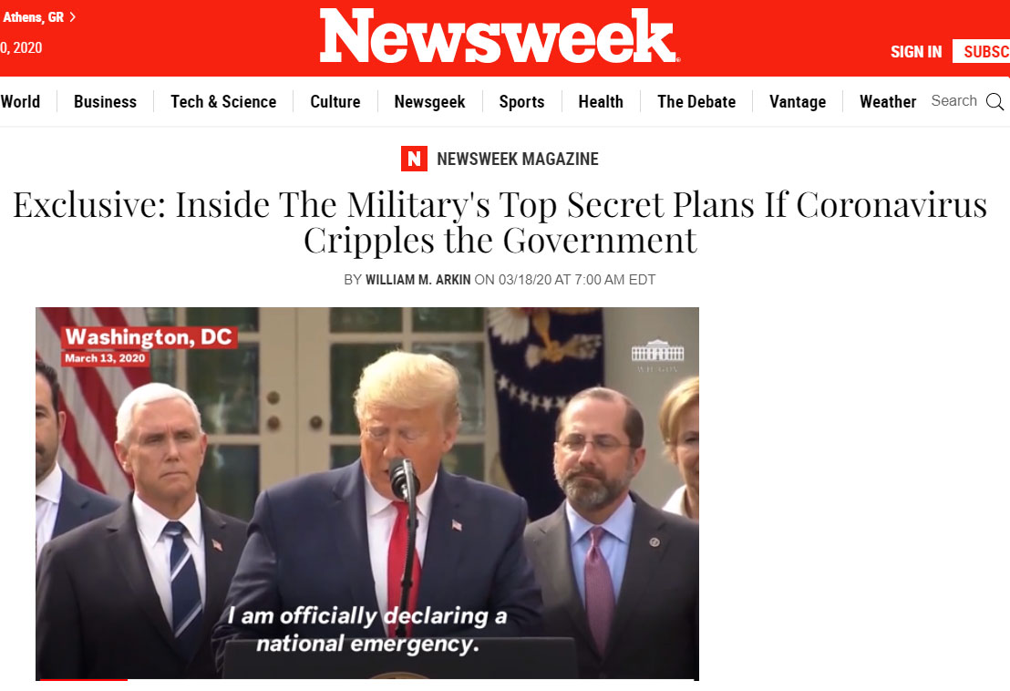Top Secret Plans If Coronavirus Cripples the Government» δεν είναι ούτε λίγο ούτε πολύ η απλή έκθεση του νομικού και τακτικού πλαισίου εφαρμογής σχεδίων εκτάκτου ανάγκης σε περίπτωση που προκληθεί κενό εξουσίας στην Ουάσινγκτον και απειληθεί η «κυβερνησιμότητα» των ΗΠΑ λόγω καταστροφικών επιπτώσεων από την πανδημία.