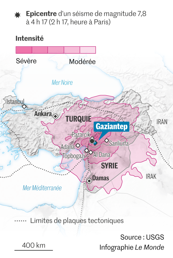 Ο σεισμός-τέρας χτύπησε στις 03:17 ώρα Ελλάδας. Τα 7,8 Ρίχτερ ταρακούνησαν όλη τη Νότια Τουρκία και τη Βόρεια Συρία. Η γη έτρεμε συνεχόμενα για ένα λεπτό της ώρας στο Γκαζιαντέπ, στην Αντιόχεια, το Χαλέπι, τη Χάμα, τη Λαττάκεια, την Ταρτούς.