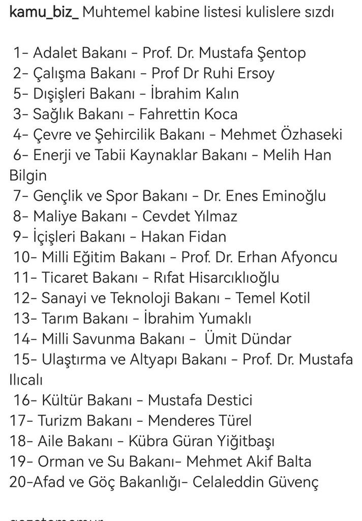 Αν και δεν έχουν κοπάσει οι ιαχές του εκλογικού θριάμβου στην Τουρκία ο Ερντογάν ήδη έπιασε δουλειά . Αργά το απόγευμα της Τρίτης τα τουρκικά ΜΜΕ δημοσιοποίησαν μία προφανώς εσκεμμένη διαρροή από την Προεδρία της Δημοκρατίας. Μία λίστα με είκοσι ονόματα Υπουργών της νέας κυβέρνησης. O Χακάν Φιντάν, o αρχηγός των Μυστικών Υπηρεσιών, της ΜΙΤ, ο οποίος φιλοδοξούσε να αναλάβει ως γενικός πληρεξούσιος με την αμέριστη προεδρική στήριξη, την τουρκική διπλωματία τελικά φαίνεται να καταλήγει στο Υπουργείο Εσωτερικών. Ο προκάτοχός του, ο απερίγραπτος Σοϊλού προς το παρόν παραμένει σπίτι του αν πιστέψουμε τις φήμες.