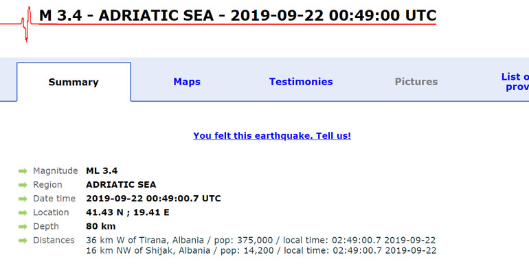 Στις 3.49 (ώρα Ελλάδας) σημειώθηκε ακόμη ένας σεισμός 3,4 R με επίκεντρο 36 χιλιόμετρα δυτικά των Τιράνων.