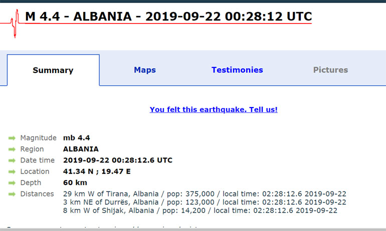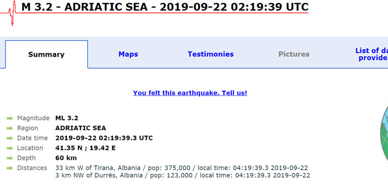 Το επίκεντρο της σεισμικής δόνησης των 4,4 βαθμών της κλίμακας Ρίχτερ εντοπίζεται 4 χιλιόμετρα βορειοανατολικά του Δυρραχίου και το εστιακό βάθος υπολογίζεται στα 60 χλμ.