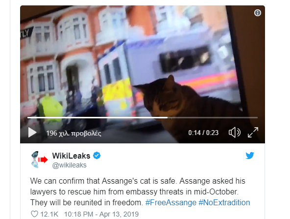 «Μπορούμε να επιβεβαιώσουμε ότι ο γάτος του Ασάνζ είναι ασφαλής. Ο Ασάνζ είχε ζητήσει από τους δικηγόρους του να τον πάρουν έπειτα από απειλές της πρεσβείας στα μέσα Οκτωβρίου. Θα επανενωθούν στην ελευθερία», ανέφερε στο twitter το WikiLeaks αργά το Σάββατο, αναρτώντας βίντεο του γάτου.