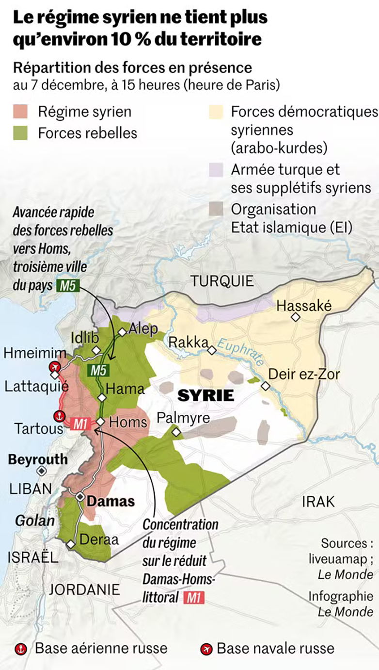 Η κατάσταση αυτή που καταγράφεται στον χάρτη απεικονίζει την πραγματικότητα στη Συρία όπως έχει διαμορφωθεί το βράδυ του Σαββάτου 7 Δεκεμβρίου.