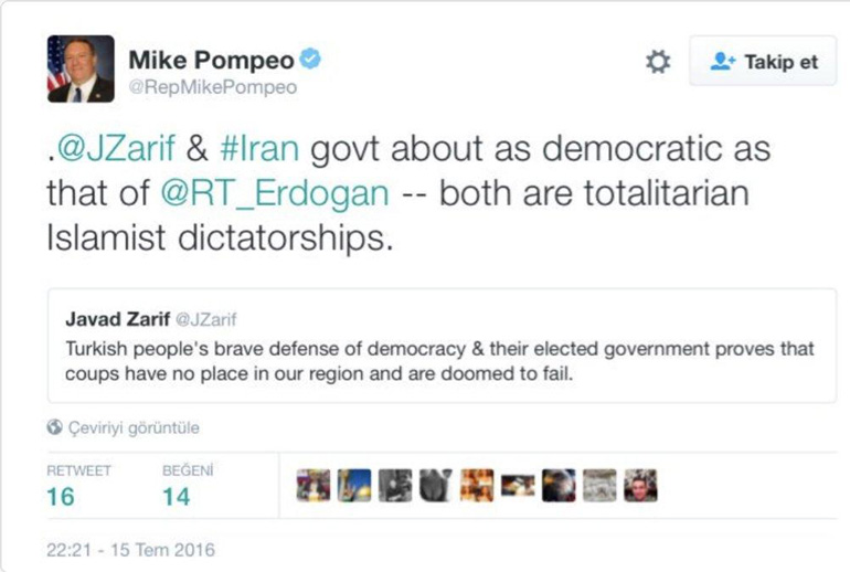 Σε ανάρτησή του στο Twitter από εκείνη την περίοδο, ο Μάικ Πομπέο αναφέρει σχετικά: «Η κυβέρνηση του Ιράν είναι τόσο δημοκρατική όσο περίπου και αυτή του Ερντογάν – και οι δύο είναι απολυταρχικές ισλαμιστικές δικτατορίες».