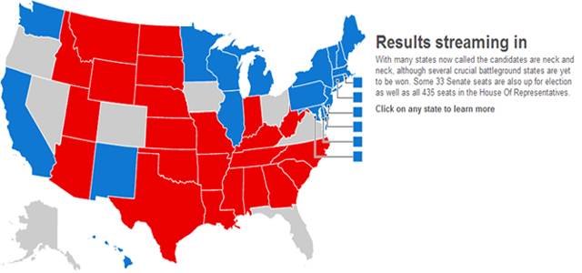 Σύμφωνα με το αμερικανικό τηλεοπτικό δίκτυο CNN, οι Ρεπουμπλικάνοι θα διατηρήσουν την πλειοψηφία στη Βουλή των Αντιπροσώπων και οι Δημοκρατικοί στη Γερουσία, με τον Barack Obama να διατηρεί ισχνό προβάδισμα στη Φλόριντα, την ίδια στιγμή που η μάχη για το Οχάιο και τη Βιρτζίνια συνεχίζεται.