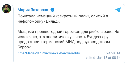«Διάβασα το γερμανικό “μυστικό σχέδιο” που διέρρευσε η χωματερή της Bild. Δυνατό το περσινό ωροσκόπιο για τους Ιχθύες στον Καρκίνο», είπε και συμπλήρωσε η Ρωσίδα αξιωματούχος: «υποθέτω ότι την ανάλυση ανέλαβε το γερμανικό υπουργείο Εξωτερικών με επικεφαλής την Αναλένα Μπέρμποκ».