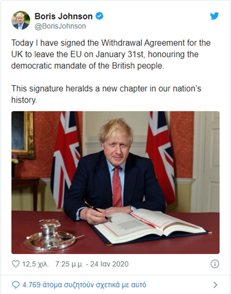 Ο πρωθυπουργός της Βρετανίας Μπόρις Τζόνσον ανακοίνωσε μέσω του Twitter ότι υπέγραψε τη Συμφωνία Αποχώρησης του Ηνωμένου Βασιλείου από την Ευρωπαϊκή Ένωση, χαιρετίζοντας «ένα νέο κεφάλαιο στην ιστορία» της χώρας του.