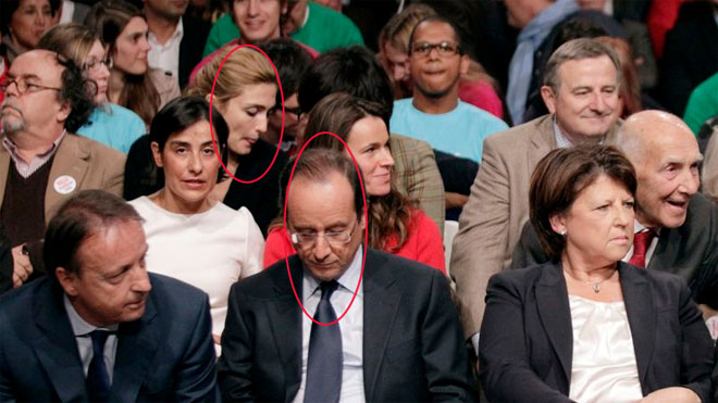 Ο Ολάντ στο συνέδριο του Σοσιαλιστικού Κόμματος το 2011 και με τις τρεις γυναίκες της ζωής του. Αριστερά, η πρώην σύντροφός του και μητέρα των τεσσάρων παιδιών του Σεγκολέν Ρουαγιάλ, ο ίδιος στη μέση κοιτάζει έκπληκτος τη Βαλερί Τριερβελέρ με την οποία συνδέεται από το 2002 και πίσω η Ζουλί Γκαγιέ. Δίπλα του η αντίπαλός του στις εσωκομματικές εκλογές Μ. Ομπρί ακούει τη συζήτηση του Ολάντ με την Τριερβελέρ.