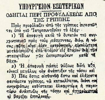 «Αξιωματικοί, βουλευταί, γνωσταί κυρίαι του κόσμου απεβίωσαν εντός ολίγων ημερών από γρίπην βαρυτάτης μορφής. Ολόκληρα συντάγματα προσεβλήθησαν και εστρώθησαν “ψάθα” εις τα νοσοκομεία. Ωρισμένα τραμ εσταμάτησαν ελλείψει υπαλλήλων, κατακειμένων όλων! Οι κινηματογράφοι έκλεισαν διά να μη μεταδίδεται το μόλυσμα. Τα σχολεία επίσης. Αι εορταί κατηργήθησαν, αι συγκεντρώσεις εις κλειστούς χώρους απηγορεύθησαν, γίνεται δε σκέψις αναβολής και αυτών… των δημοτικών εκλογών!». Αυτά έγραφε η εφημερίδα «Θεσσαλία» τον Ιούλιο του 1918. «Γιατί φοβόμαστε τη γρίπη;»