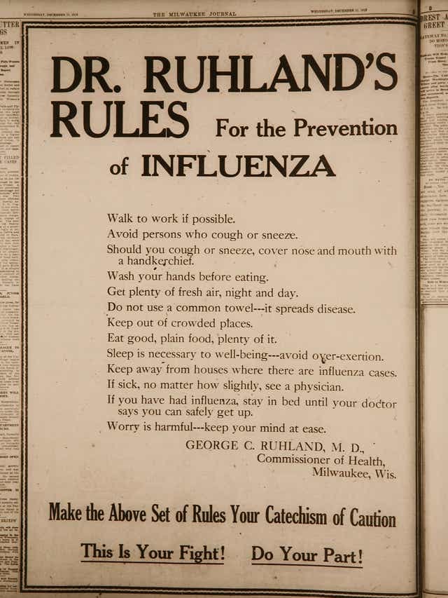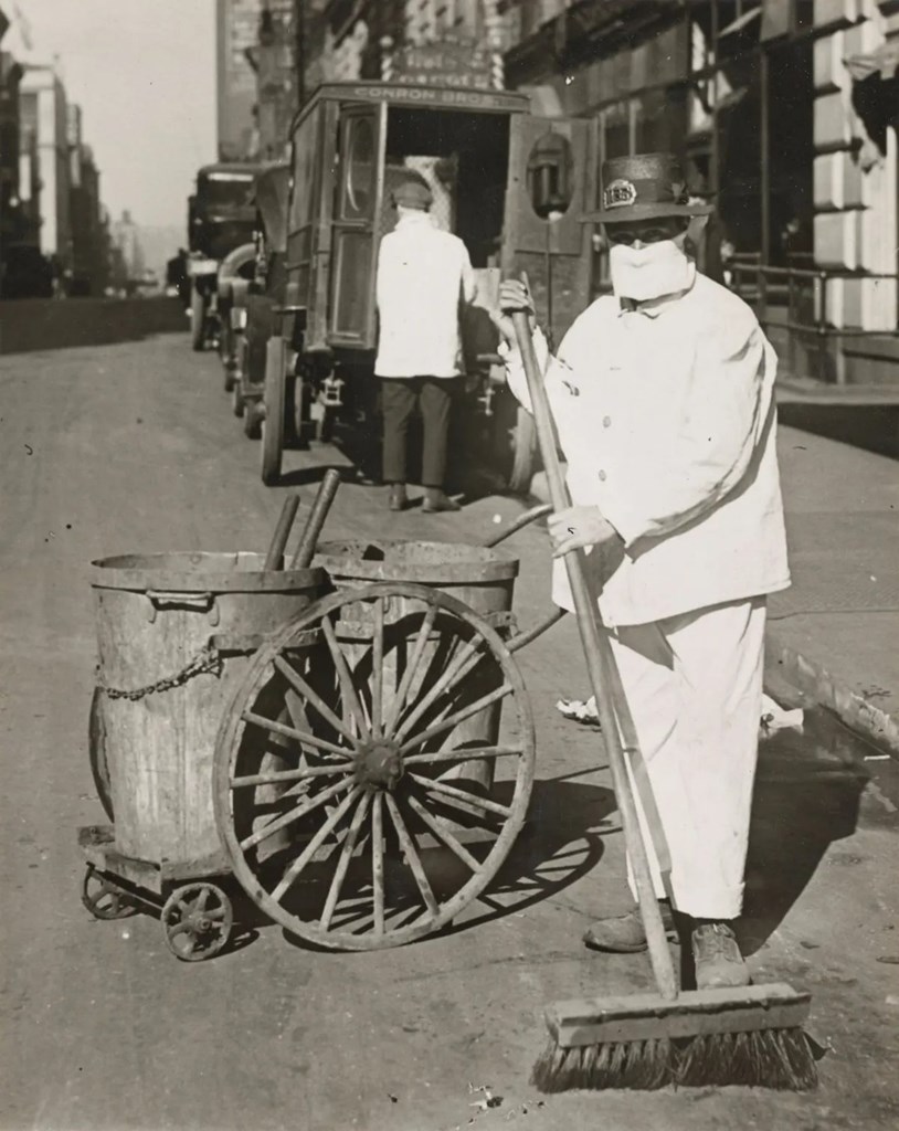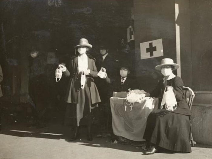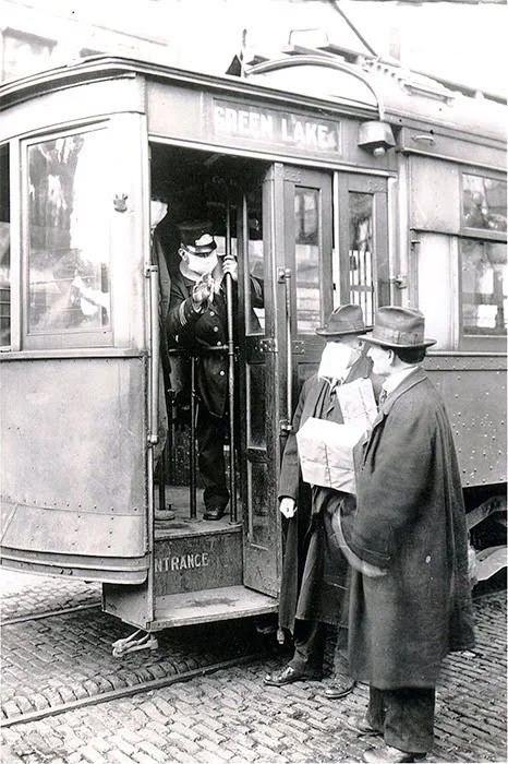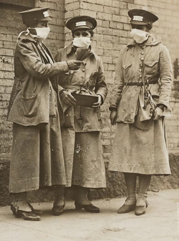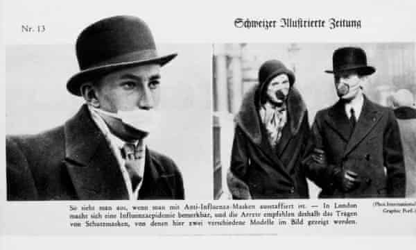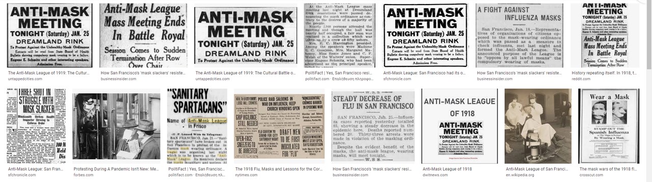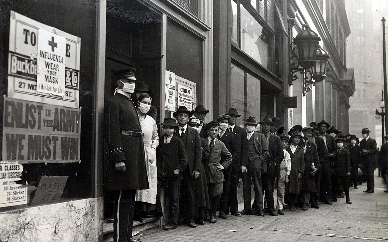 Σε φωτογραφία του 1918, χαρακτηριστική είναι η μεγάλη ουρά που σχηματίζουν πολίτες του San Francisco για να προμηθευτούν μάσκες. Το κατάστημα έχει ταμπέλες με την ένδειξη INFLUENZA WEAR YOUR MASK. Δυστυχώς όμως ακριβώς όπως και σήμερα άνθρωποι συνωστίζονται στην ουρά.