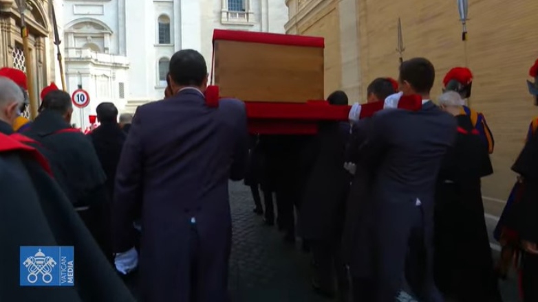 Αυτή την ώρα γίνεται η μεταφορά στο σκήνωμα του Πάπα Φραγκίσκου στη Βασιλική του Αγίου Πέτρου, όπου θα τεθεί σε λαϊκό προσκύνημα για τους χιλιάδες πιστούς που πρσέρχονται στο Βατικανό για το τελευταίο αντίο στον αγαπητό τους «Ποντίφικα των φτωχών».