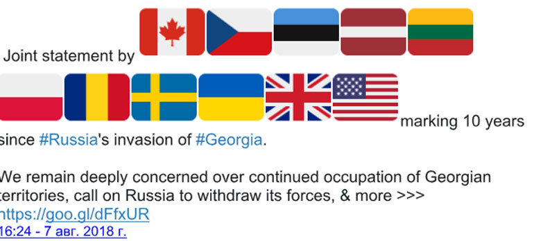 όσο και το υπουργείο Εξωτερικών της Δανίας, «υπενθύμισαν» στο Twitter τους πως «συμπληρώθηκαν 10 χρόνια από την ρωσική εισβολή στην Γεωργία». Εκφράζοντας ταυτόχρονα την ανησυχία τους «για την εξακολούθηση της κατοχής περιοχών της Γεωργίας από την Ρωσία».
