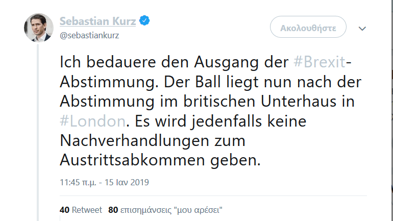 Ο καγκελάριος της Αυστρίας Σεμπάστιαν Κουρτς διαμήνυσε απόψε ότι η συμφωνία μεταξύ του Λονδίνου και των Βρυξελλών για το Brexit δεν επιδέχεται επαναδιαπραγμάτευσης.