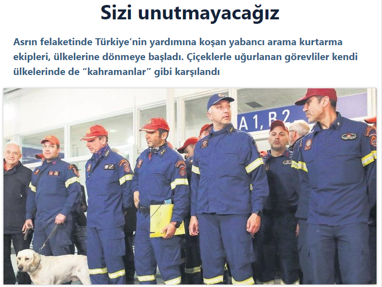Το δημοσίευμα της Τουρκικής «Sabah», που ακολουθεί με τον τίτλο «Δεν θα σας ξεχάσουμε», αναφέρεται στις ομάδες έρευνας και διάσωσης που έφτασαν στην Τουρκία και επιστρέφουν στις χώρες τους, κάνοντας ιδιαίτερη αναφορά στην Ελληνική ΕΜΑΚ, η οποία απεικονίζεται και στη φωτογραφία του άρθρου.