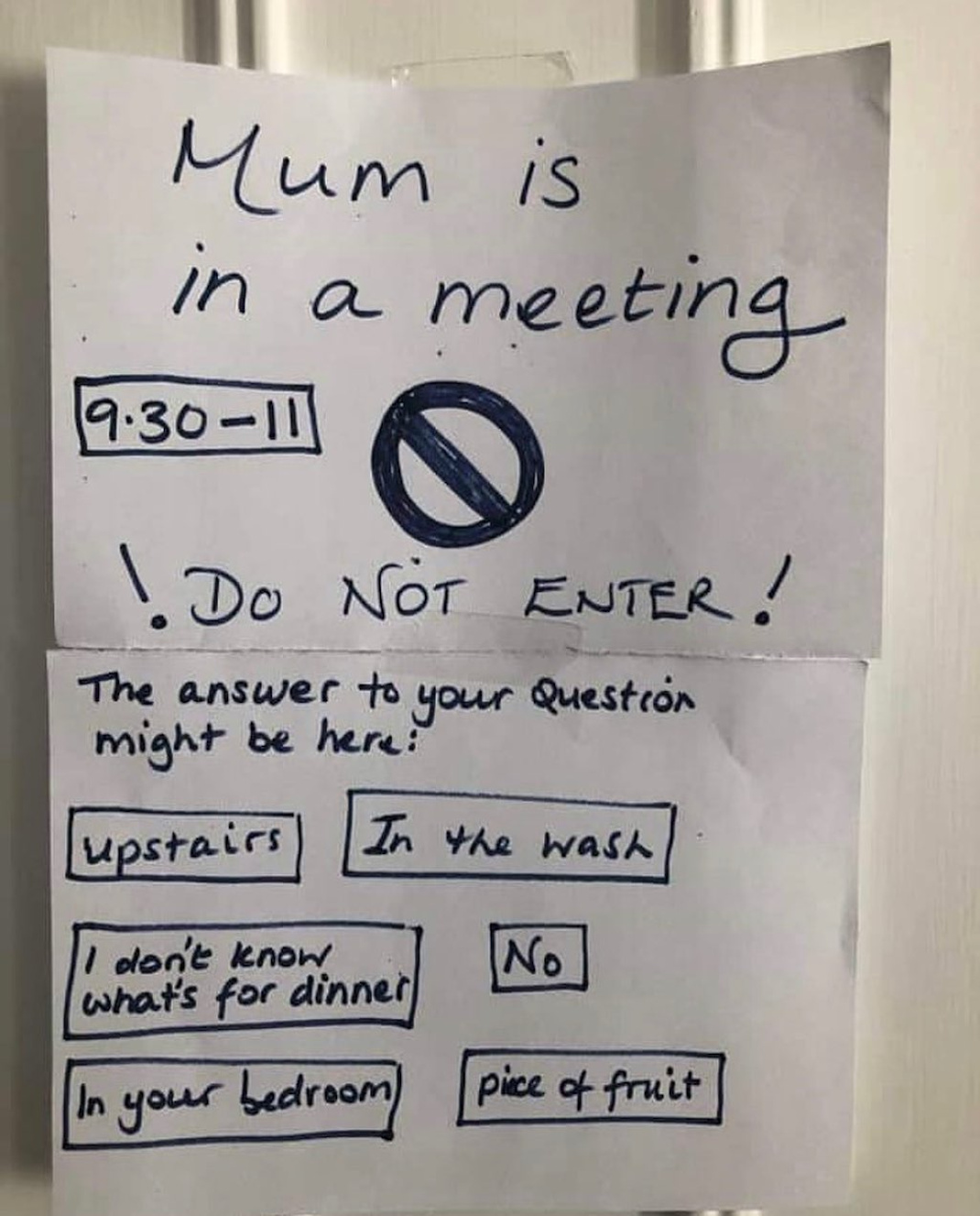 Μία εργαζόμενη μητέρα που αντιμετωπίζει αυτό το πρόβλημα ανάρτησε στο Twitter τις απαντήσεις που έγραψε σε ενδεχόμενες ερωτήσεις των παιδιών της, έτσι ώστε να μην την ενοχλήσουν καθόλου την ώρα μιας τηλεφωνικής διάσκεψης που είχε η ίδια με τους συναδέλφους της, με διάρκεια μιάμισης ώρας.